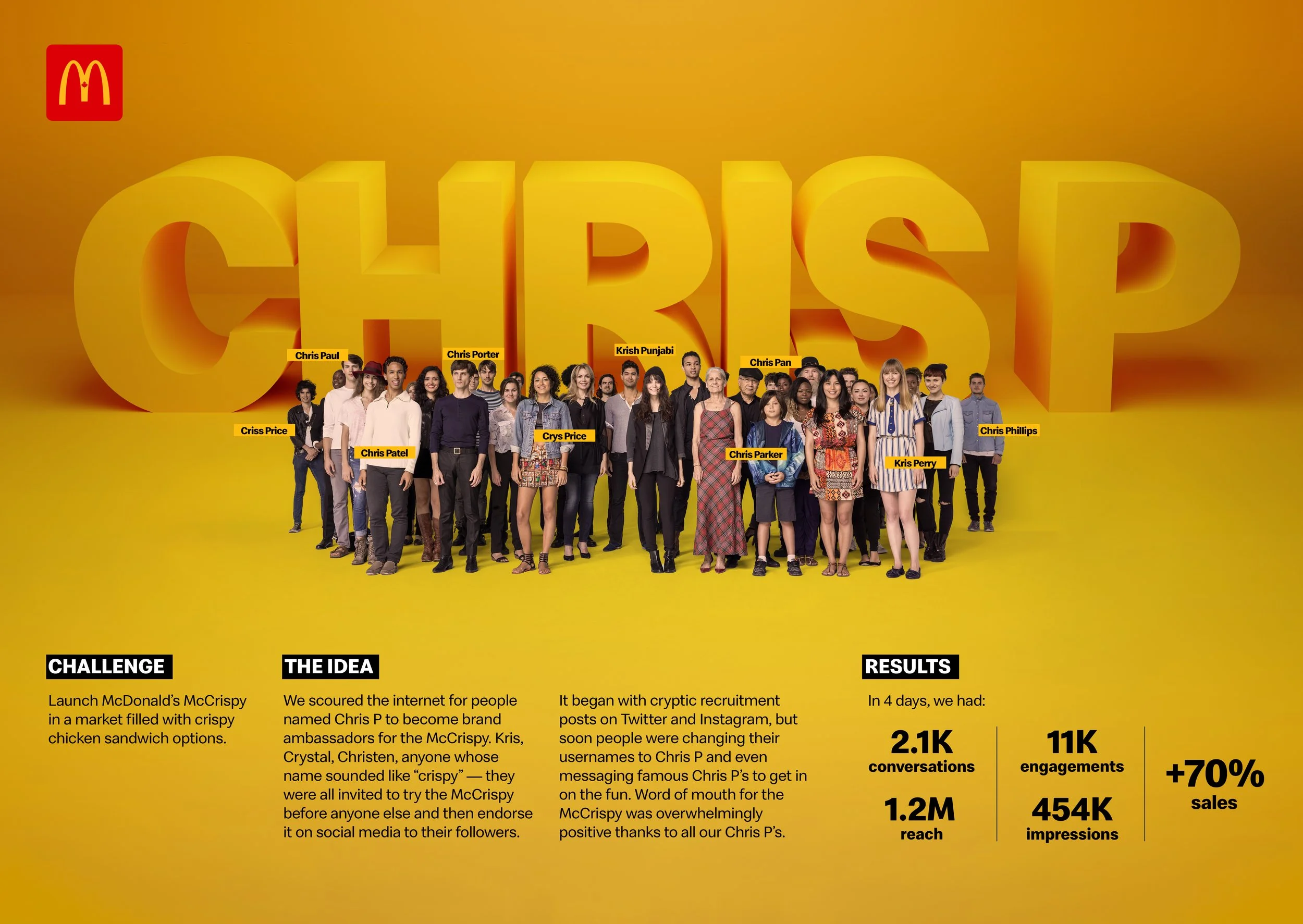 In a market saturated with Crispy Chicken sandwich options, we needed to find a way to launch the new crispy chicken sandwich option from McDonald’s, the McCrispy, in a way that couldn’t be ignored. Who better to promote something crispy, than someone called Chris P.