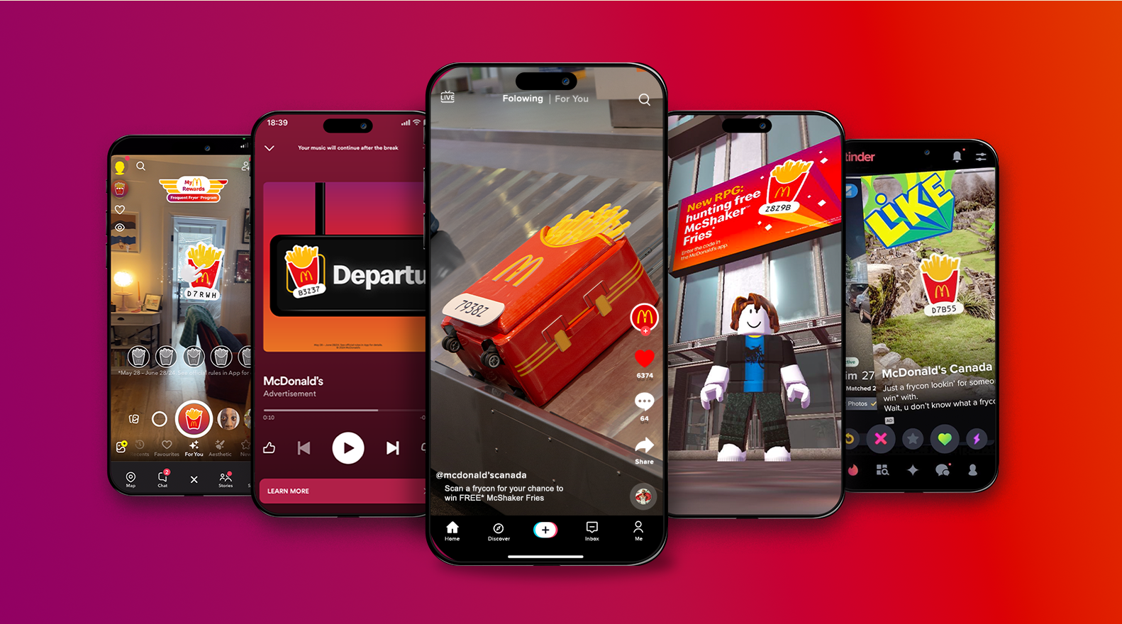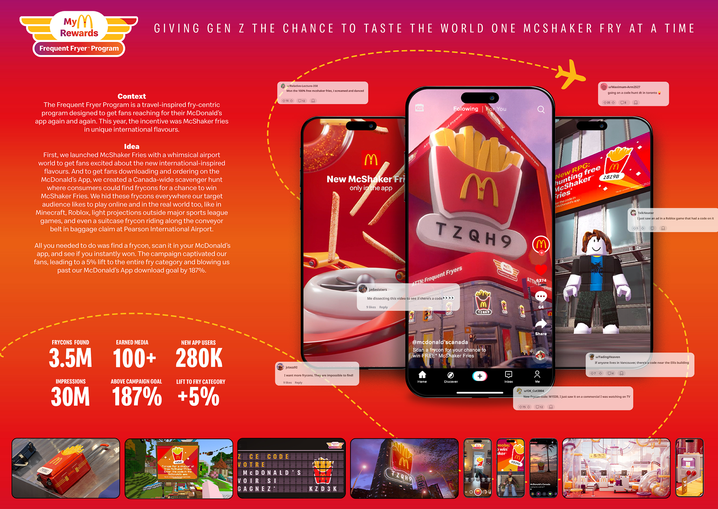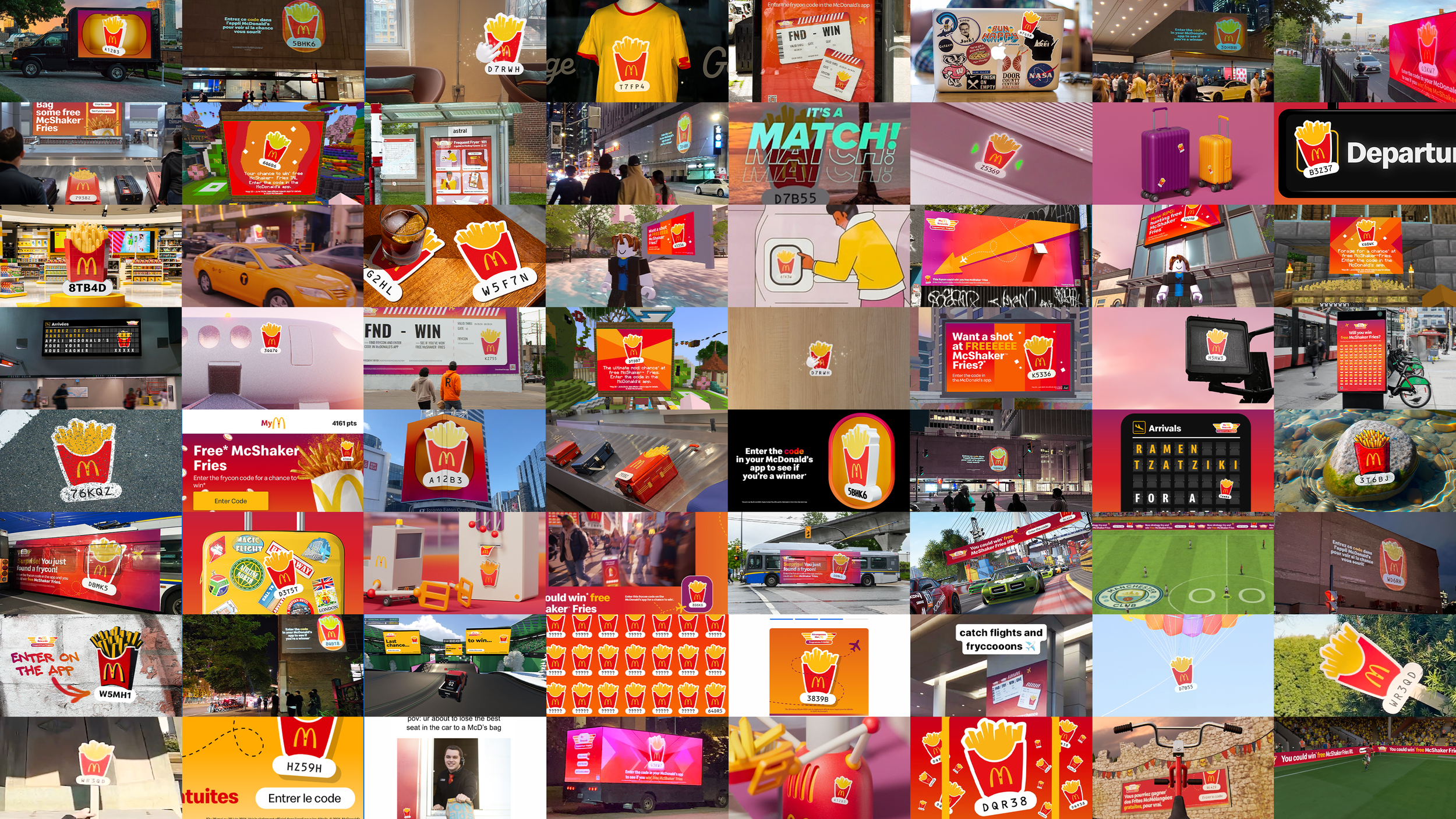 The Frequent Fryer Program. A McDonald’s App based program designed to have fans reaching for their phones and ordering McDonald’s, by offering fry-based incentives. This year, the incentive was free McShaker Fries in unique international flavours. To launch, we created a whimsical airport setting to let people know about the new flavours. Then to get people ordering on the app, we created a Canada wide scavenger hunt where consumers had to find ‘frycons’ for a chance to win. We hid frycons everywhere - in the real world and the digital one. The campaign was a huge success, generating a 5% lift to the overall fry category, (that’s enough fries to stretch from Toronto to Guatemala.)